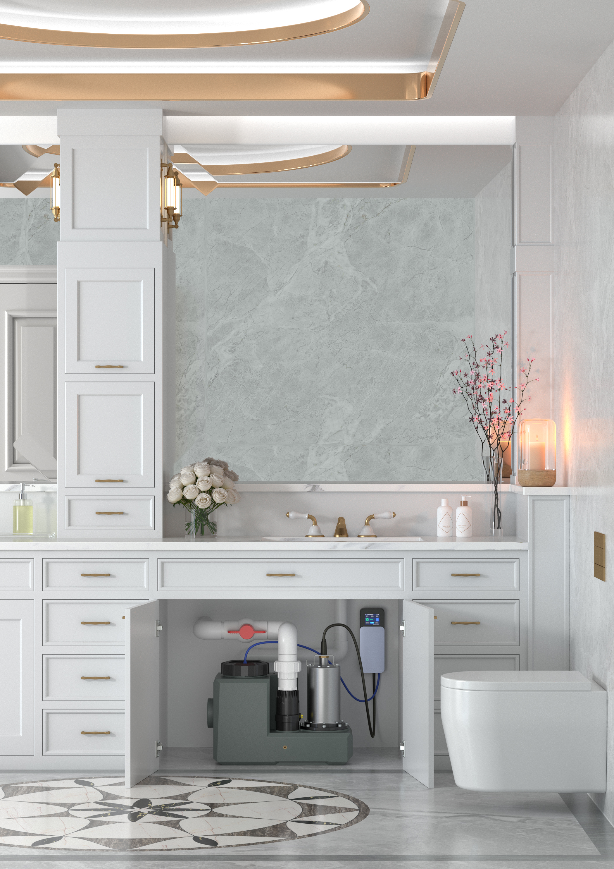新增的衛(wèi)生間由于沒有規(guī)劃排水管道,是沒有排水口的,要想簡單的快速解決,智能污水提升器是比較好的一個選擇了,將衛(wèi)生間潔具的排水口連接到機器的進水口,將機器的排水口連接到就近的主排污管道中,這樣在不破壞地面的情況下就能將這個新的用水空間的排水系統(tǒng)建立起來了。