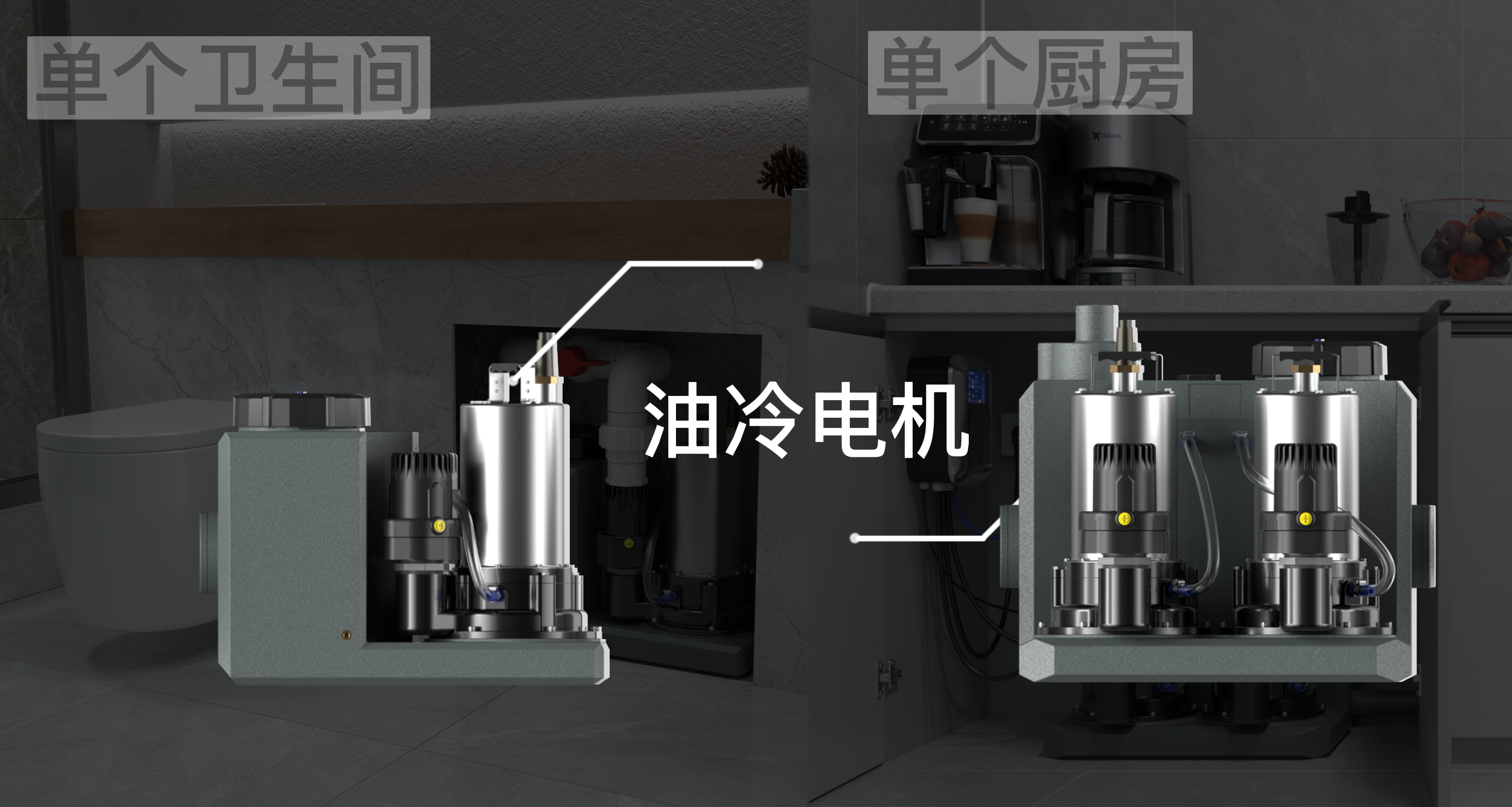 第一,如果家里只有一個排水單元,像是一個衛生間,一個水吧臺或是一個洗衣房的話,我們用油冷電機的小型污水提升泵就足夠了,不僅聲音小,性價比也是更高,使用的時間長,穩定性會更好。