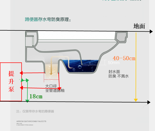 ②地面抬高安裝如果選擇蹲便器地面抬高,也同樣需要確保蹲便器落水點與提升泵進(jìn)水口中心點至少18cm的落差。地面所需抬高的高度,就與蹲便器的深度有關(guān),市面上的蹲便器深度在20-40cm不等。