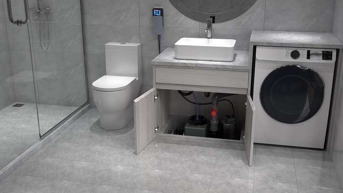 如果地下室沒有預留坑位,提升泵需要安裝在地面,后排式馬桶和壁掛馬桶也是比較簡單的,因為下水點高,同樣無需抬高地面去做安裝。潔具下水口與提升泵進水口管道相連對接就可以了。