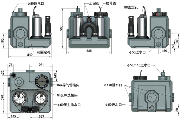 · 入水口:3×φ110,3×φ50,1×φ50/110